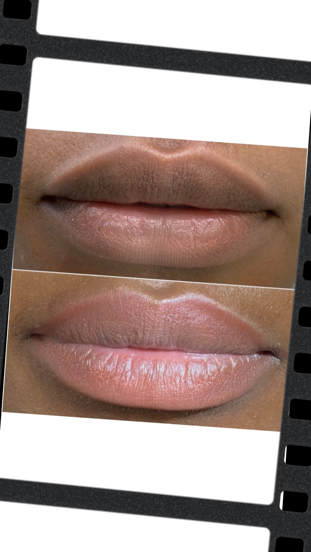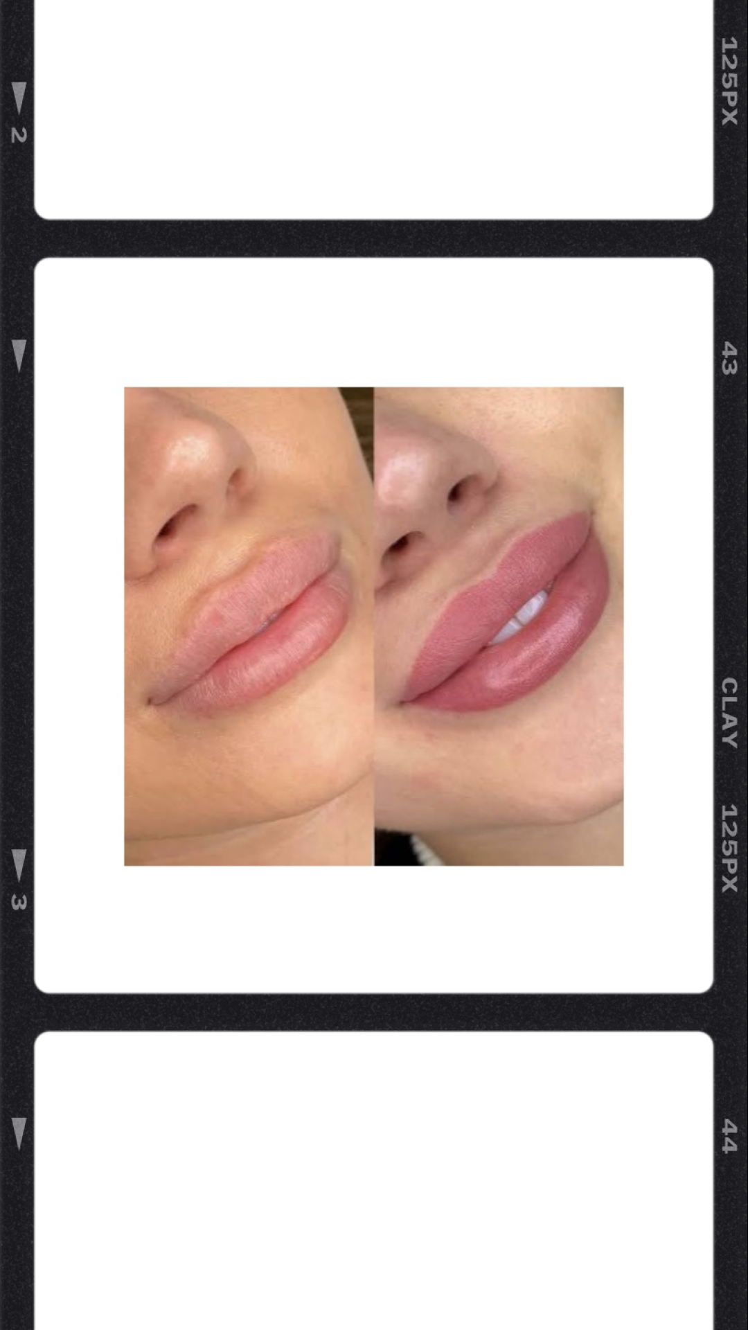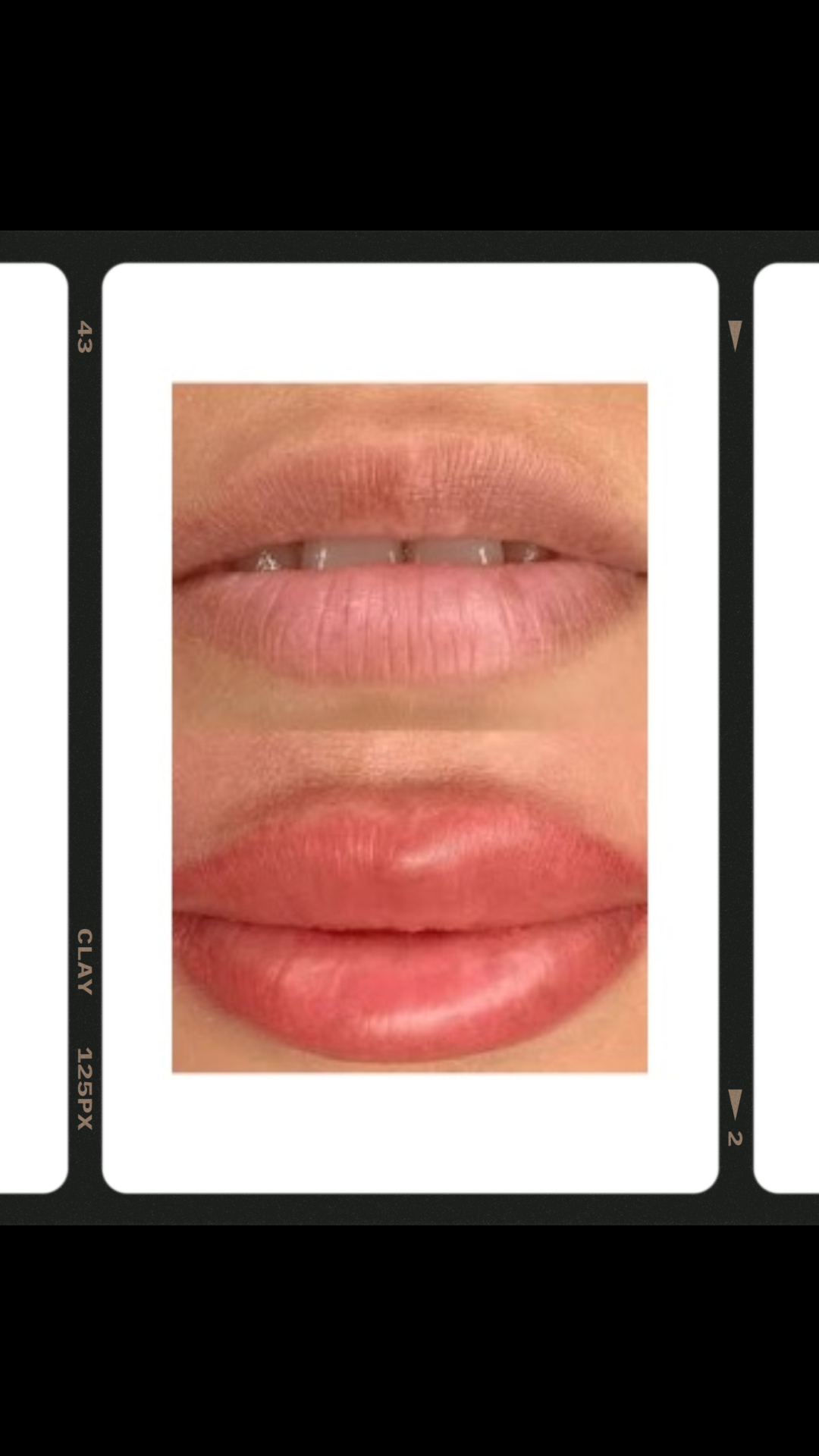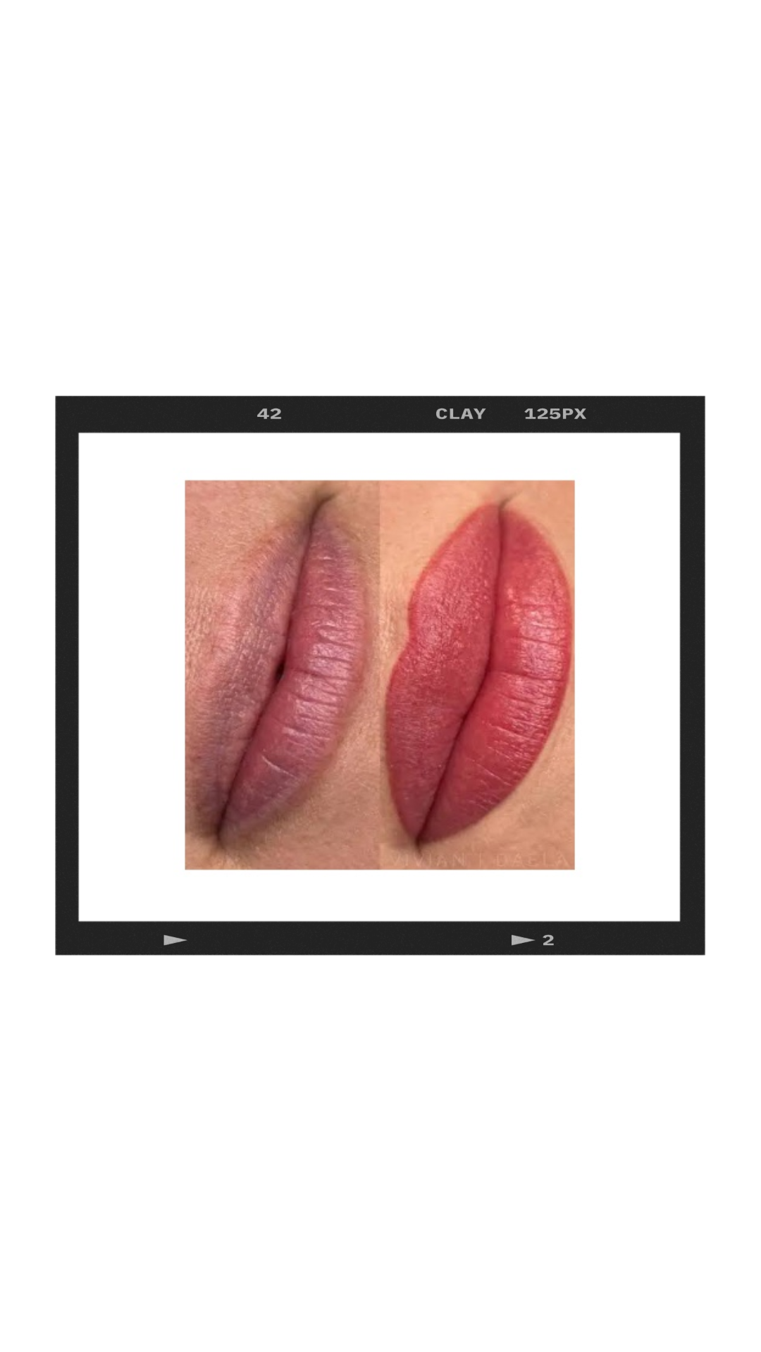 the entire procedure usually requires two appointments, the initial pigmentation session and a re-touch appointment within 1-3 months of the first treatment. at the first appointment, clients get a full consultation during which their lips will be assessed and a bespoke treatment plan created. lips will be numbed to minimize discomfort, and the procedure will begin with detailed lip mapping, the created shape will then be precisely followed with the PMU device to ensure flawless results. the second procedure will involve adding more pigment to the lips, as certain areas may not hold as well as other areas due to the healing process and will require a top-up treatment.